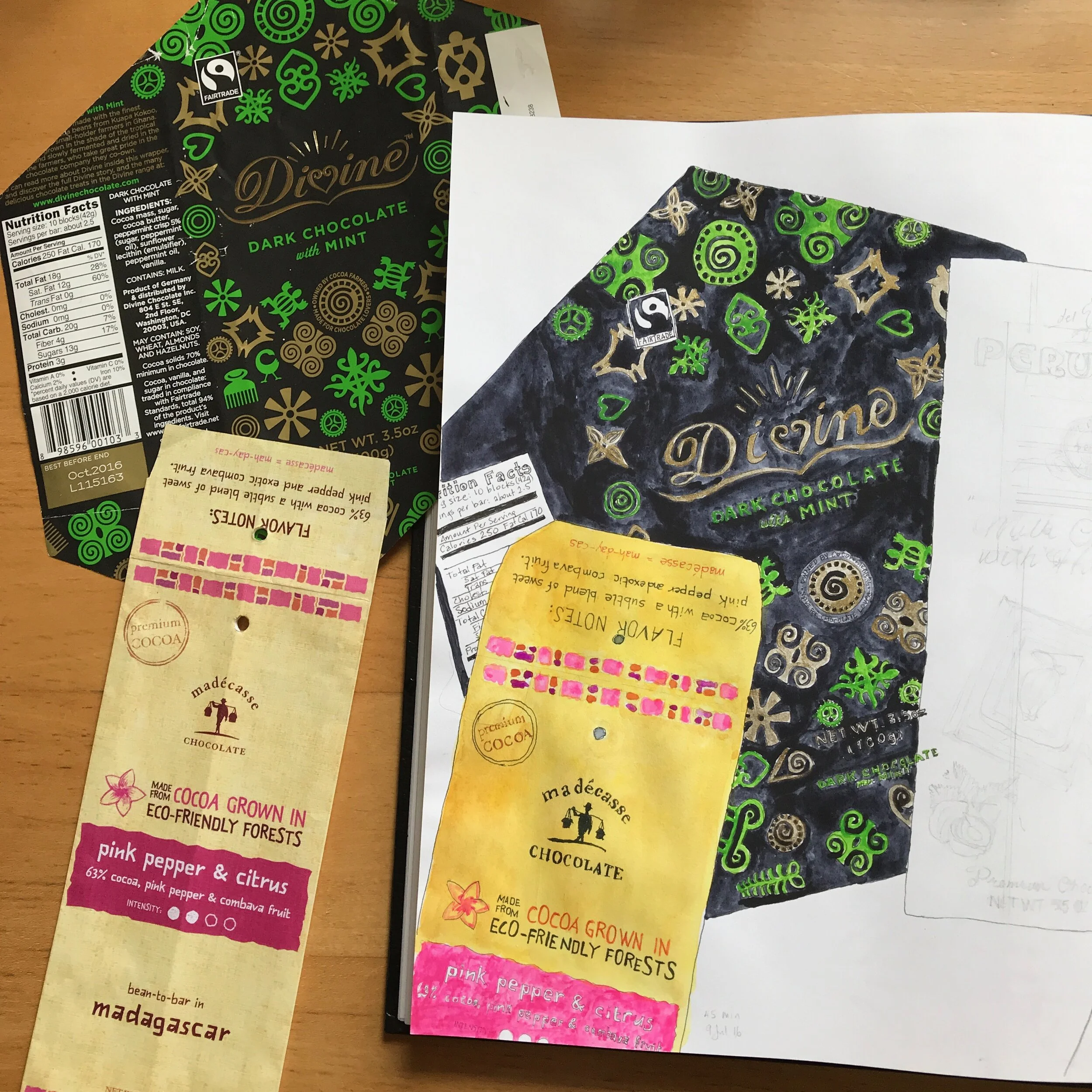 My first Daily for the Creative’s Workshop Day 1/100. Chocolate Wrappers, ink and watercolor in my sketchbook.
