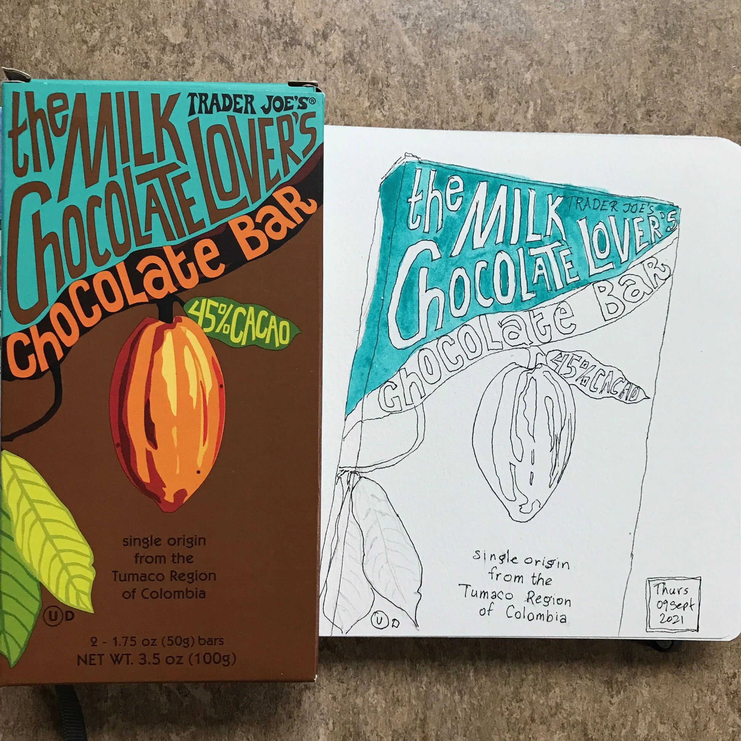 My first Daily for the Creative’s Workshop Day 1/100. Chocolate Wrappers, ink and watercolor in my sketchbook.