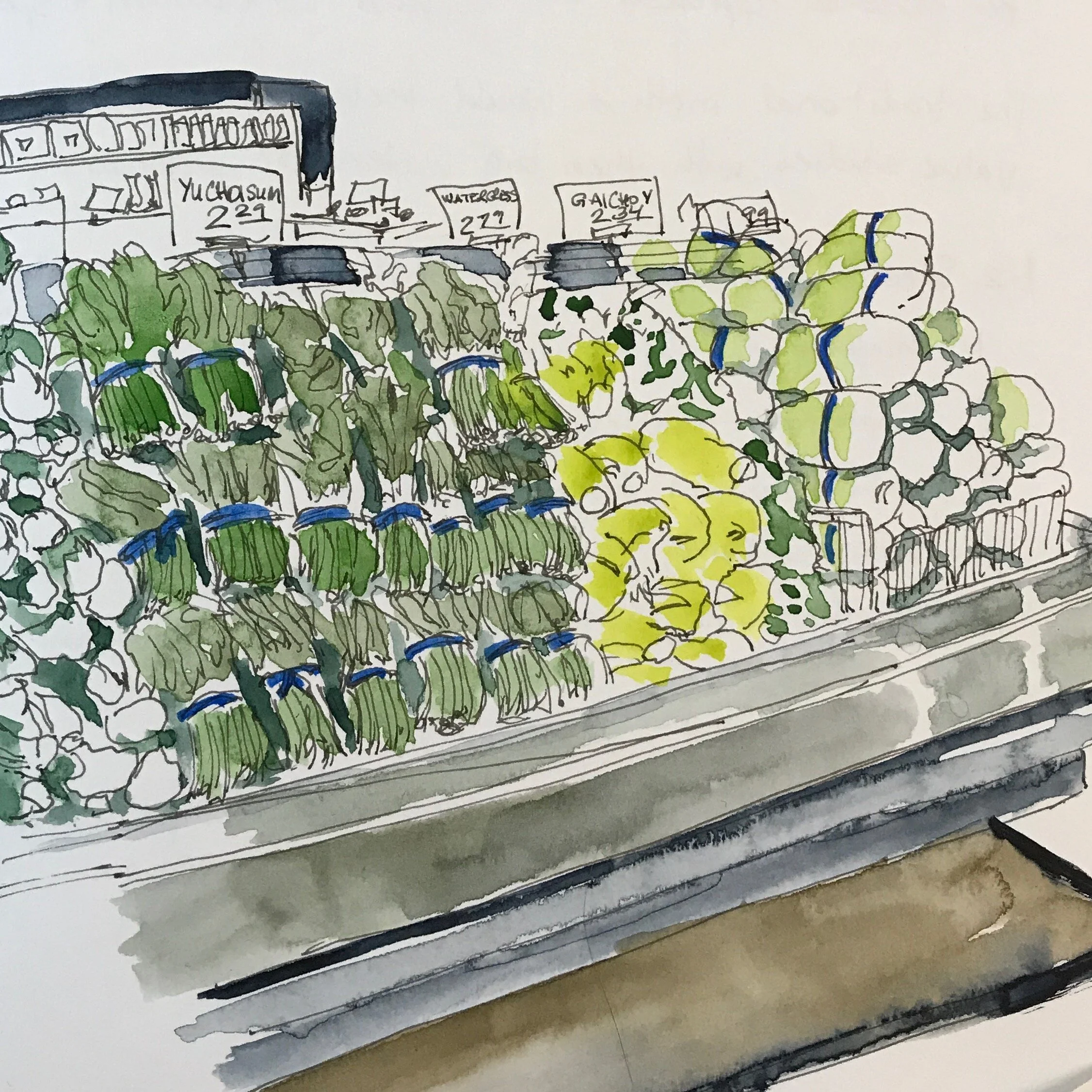 Asian greens in Uwajimaya’s veggie section, ink and watercolor