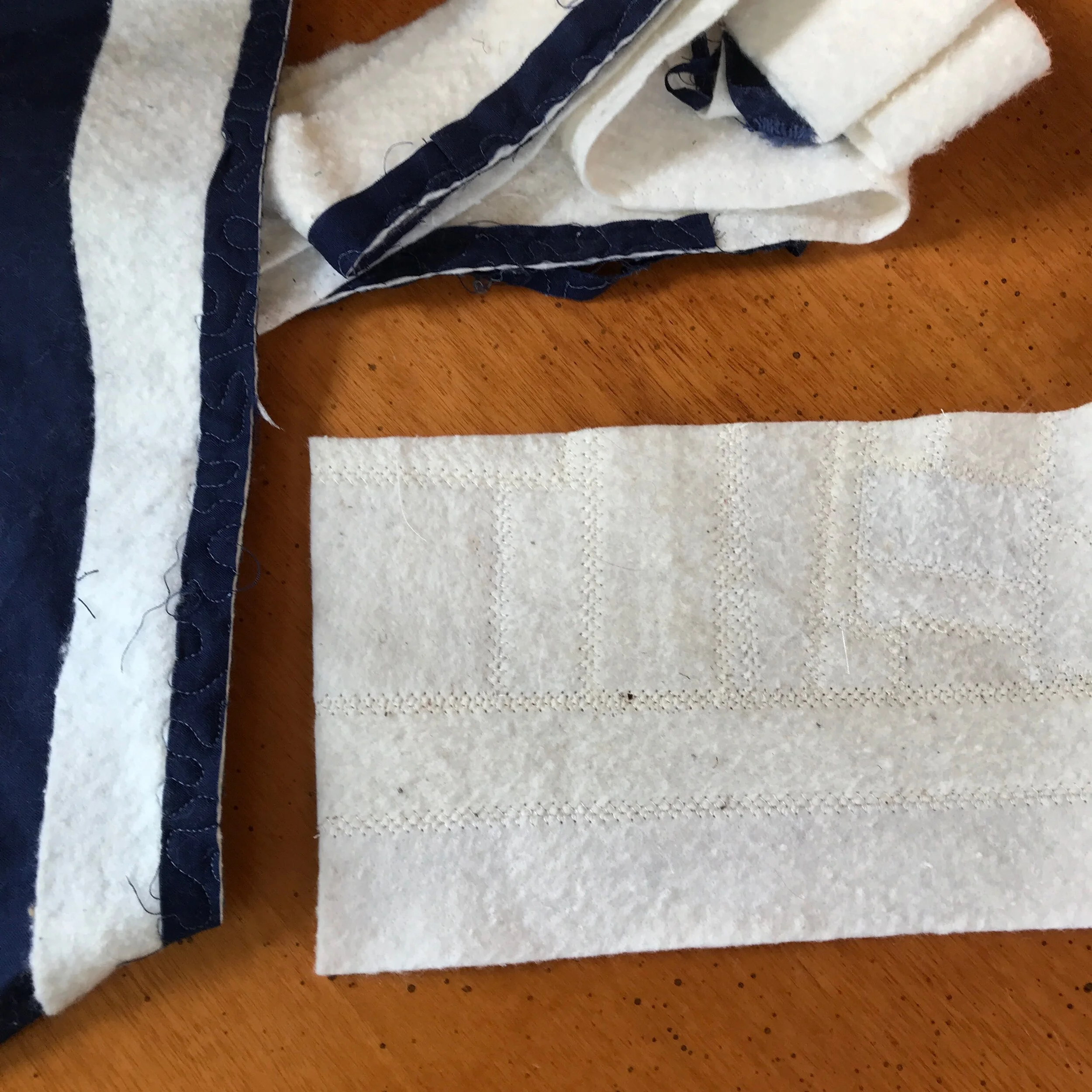 I was working on a quilting project last week and needed some batting to put in the middle of the fabric layers. When I found it, I had to stop and admire it for a while. The piece that I found was pieced from scraps of batting from other projects. I love the randomness of the different sized pieces. I remember times I’ve set aside to stitch scraps of batting together to make wider strips and then larger pieces of fabric. I enjoy the process of setting my machine to a honeycomb stitch, finding batting colored threads to use and then stitching away. This kind of pieced batting is sound for my purposes. There’s more thread, but it will work the same as a freshly cut whole piece.