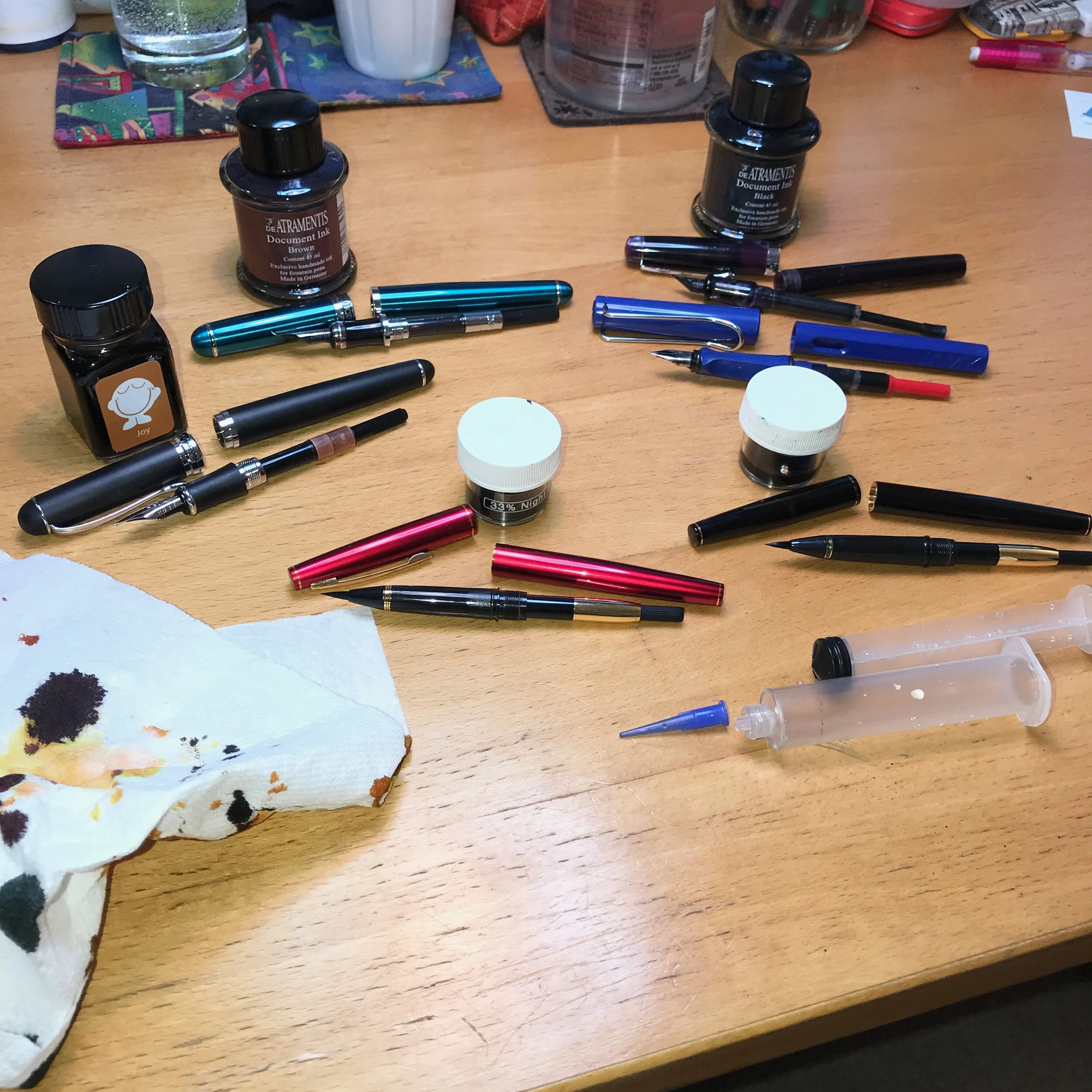 Tonight I spent some time refilling six of my pens with five different inks and five different styles of ink cartridges. Some were easy to fill and made little mess. Others required more care with the addition of a syringe to suck up some ink from the bottle to then inject enough, but not too much into the cartridge and then reassemble. Wash the syringe in order to not contaminate the next jar of ink and repeat with filling the next cartridge.. Wash hands thoroughly at the end. Fortunately soap gets rid of most of the ink stains.