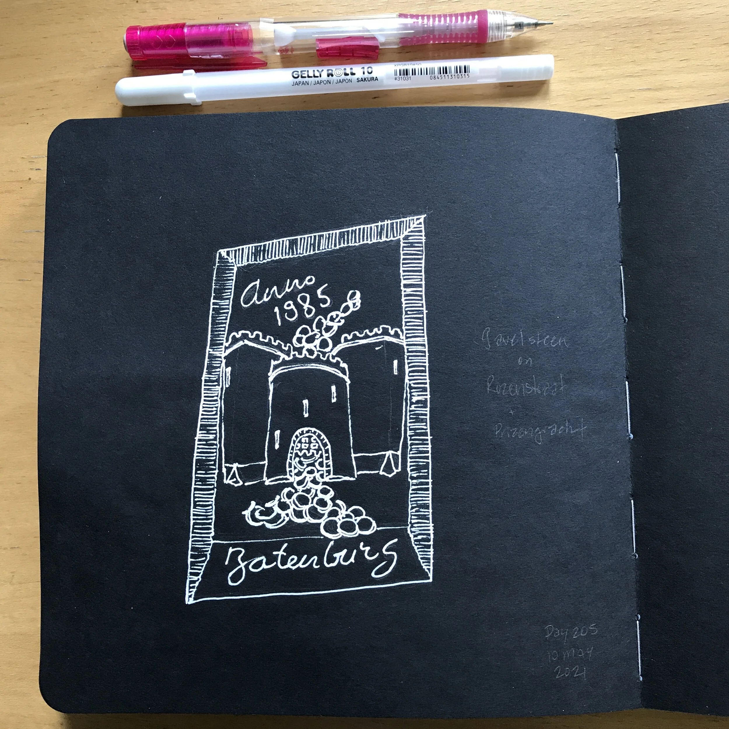 Drawing Amsterdam Dailies, Day 205. This is a #gevelsteen, a carved and painted stone tablet. I enjoyed spotting these markers around the city. Some were old. This one is relatively new from 1985. There are silver coins dropping down and gold coins coming out the gate. It’s a castle full of money. I know nothing else about it.