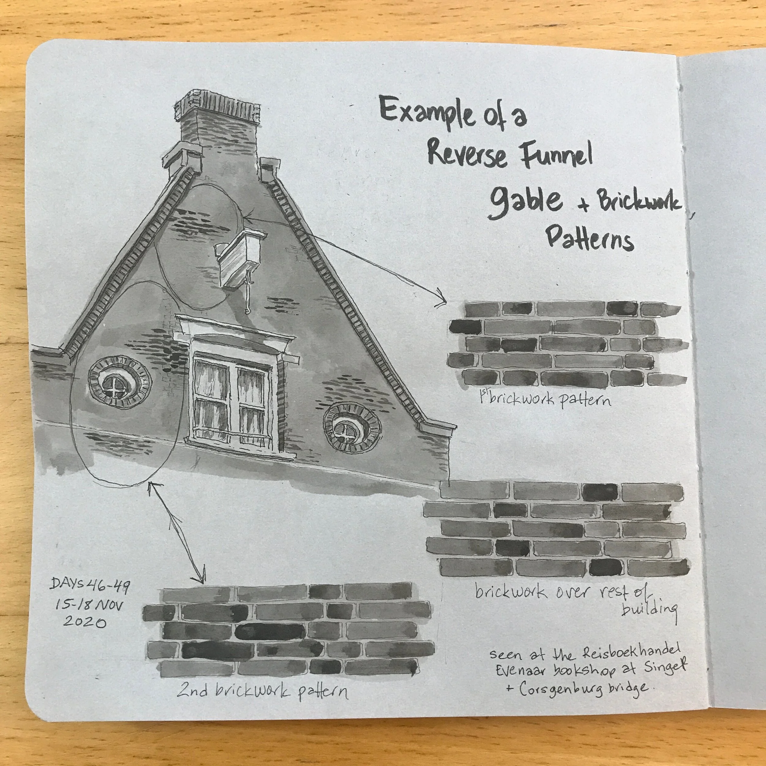 Drawing Amsterdam Dailies, Day 49. Calling this page of a reverse funnel gable and some brickwork patterns done! Welcome to what my brain likes to focus on! π