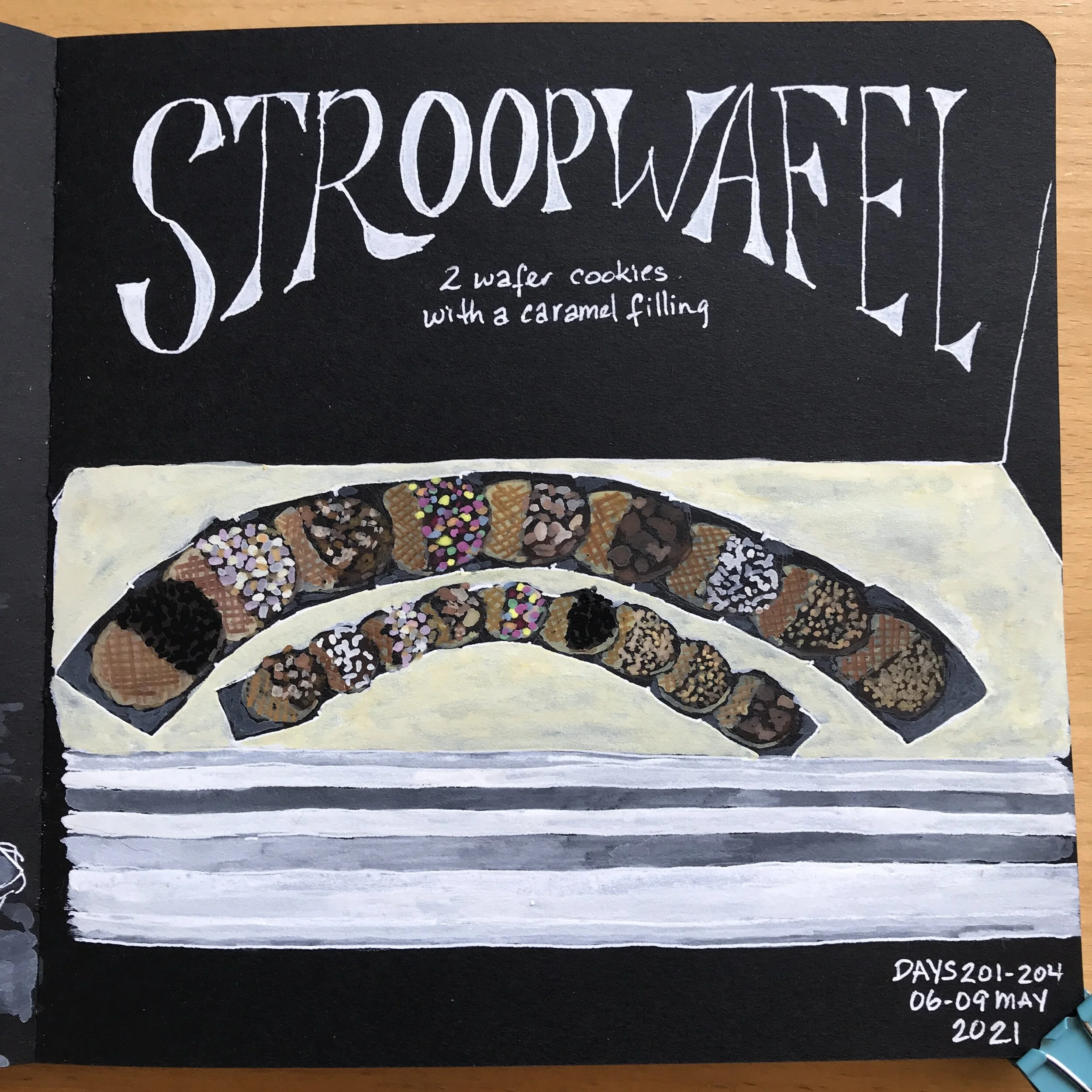 Drawing Amsterdam Dailies, Day 204. I played with adding some color to the counter to differentiate it from the window trim in from. I also added a very watery white wash on the black napkins the #stroopwafel are on. And I colored in the letters. Now it’s done. Swipe to see the spread.  #amsterdam🇳🇱 #30minutesaday #foodillustration #drawingfood #dailies #drawingdaily #dailydrawing #blackpaperart #blackpaperdrawing #creativeprocess #traveljournal #beingatourist