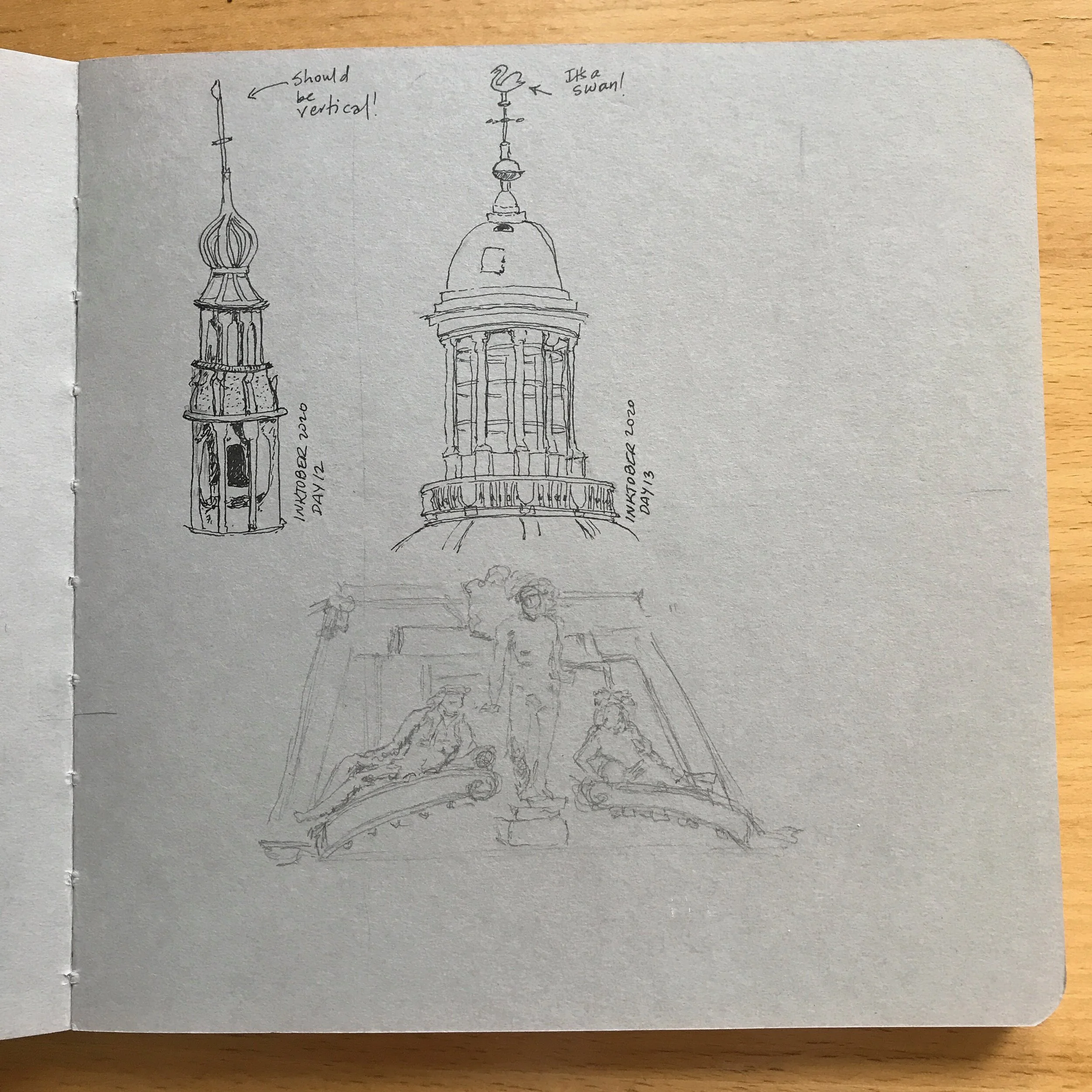 #inktober2020 Day 13. Working on more cupolas towers, and lounging statuary atop buildings seen from Amsterdam’s Centraal Station.  It’s Inktober but I like to draw in pencil first to see how to do it and then I can move it if the placement’s wrong.…